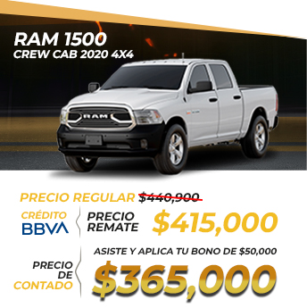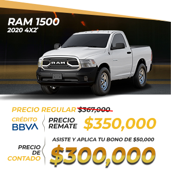 Aplica para RAM1500 CABINA REGULAR 2020 con precio de $350,000. Válido con BBVA Bancomer. Sujeto a previa aprobación de crédito. Enganche menor o igual a 25% y/o monto a financiar igual o mayor a $500,000 será necesario comprobar ingresos. Aplica para personas físicas. Tasa del 0% solo a un plazo de 12 meses, 24 meses con tasa del 3.47% y 36 meses con tasa del 7.86%. Cobertura estética incluye los siguientes beneficios: dos servicios de estética a elegir entre pulido base abrillantador, limpieza de vestiduras e interiores o mantenimiento de faros; Abolladuras menores (eventos ilimitados); reembolso de deducible por daños de parabrisas (eventos ilimitados); Cerrajero (eventos ilimitados); Robo de espejos laterales (un evento por año); Robo o extravió de llaves (un evento por año). No acumulable con otras promociones. Para más información consulta con tu Asesor Profesional de Ventas. Vigencia 9 y 10 de agosto 2025.