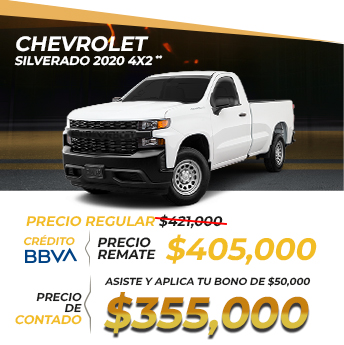 **Aplica para GM SILVERADO 2020 4.3L ST 4X2 CON AA EE AUT 6CIL con precio de $405,000. Válido con BBVA Bancomer. Sujeto a previa aprobación de crédito. Enganche menor o igual a 25% y/o monto a financiar igual o mayor a $500,000 será necesario comprobar ingresos. Aplica para personas físicas. Tasa del 9.23% sólo a un plazo de 36 meses. Cobertura estética incluye los siguientes beneficios: dos servicios de estética a elegir entre pulido base abrillantador, limpieza de vestiduras e interiores o mantenimiento de faros; Abolladuras menores (eventos ilimitados); reembolso de deducible por daños de parabrisas (eventos ilimitados); Cerrajero (eventos ilimitados); Robo de espejos laterales (un evento por año); Robo o extravió de llaves (un evento por año). No acumulable con otras promociones. Para más información consulta con tu Asesor Profesional de Ventas. Vigencia 9 y 10 de agosto 2025.